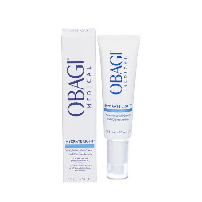 - Apply a small amount of Obagi Hydrate Light Weightless Gel Cream to your fingertips.