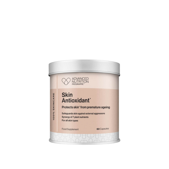 Skin Antioxidant™ from the Advanced Nutrition Programme is expertly formulated with seven plant-derived nutrients - including bilberry, turmeric, green tea, grape seed, lutein, beta-carotene, and lycopene - to help protect skin from oxidative stress caused by daily environmental exposure.